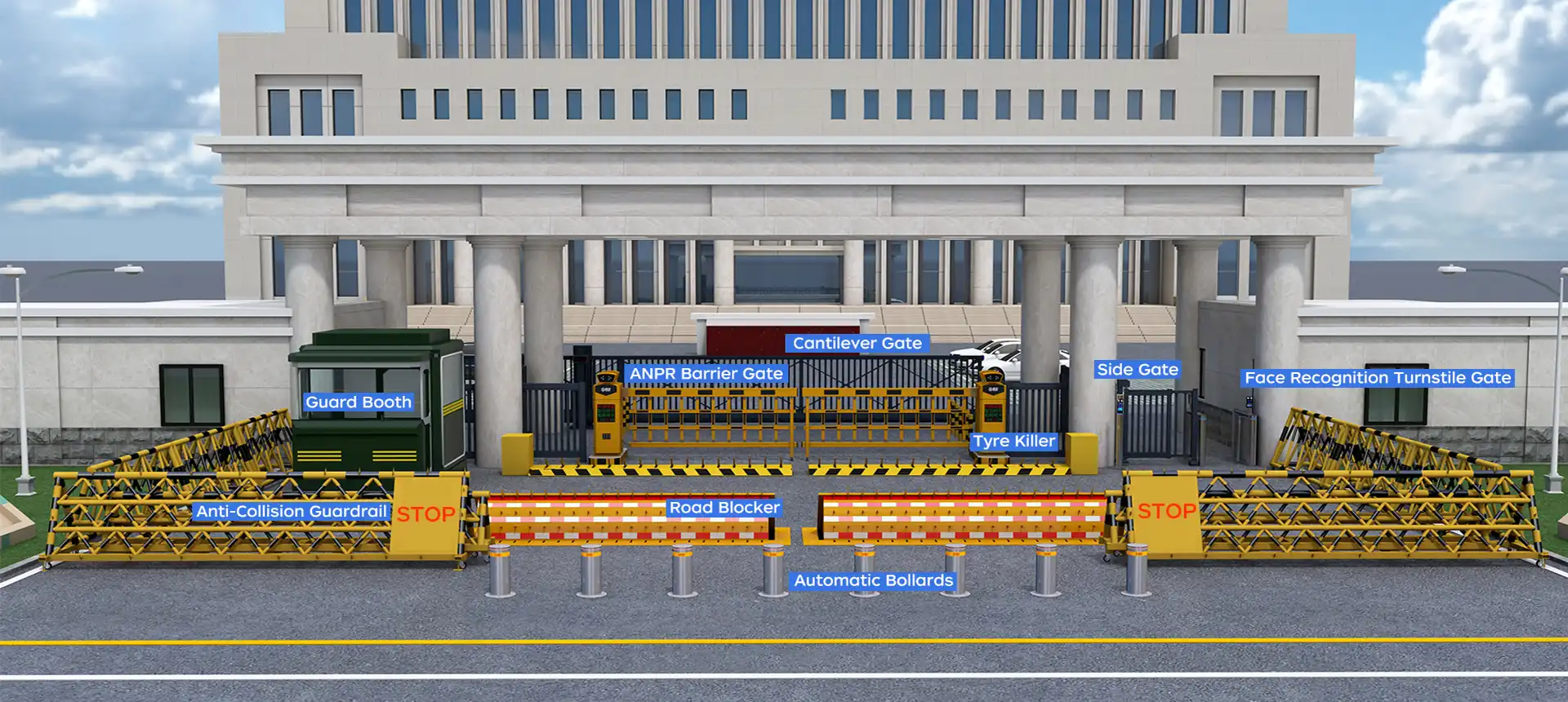 - Perimeter & Intrusion Defense: Anti-collision guardrails, tyre killers, and cantilever gates provide strong physical protection against forced entry.
