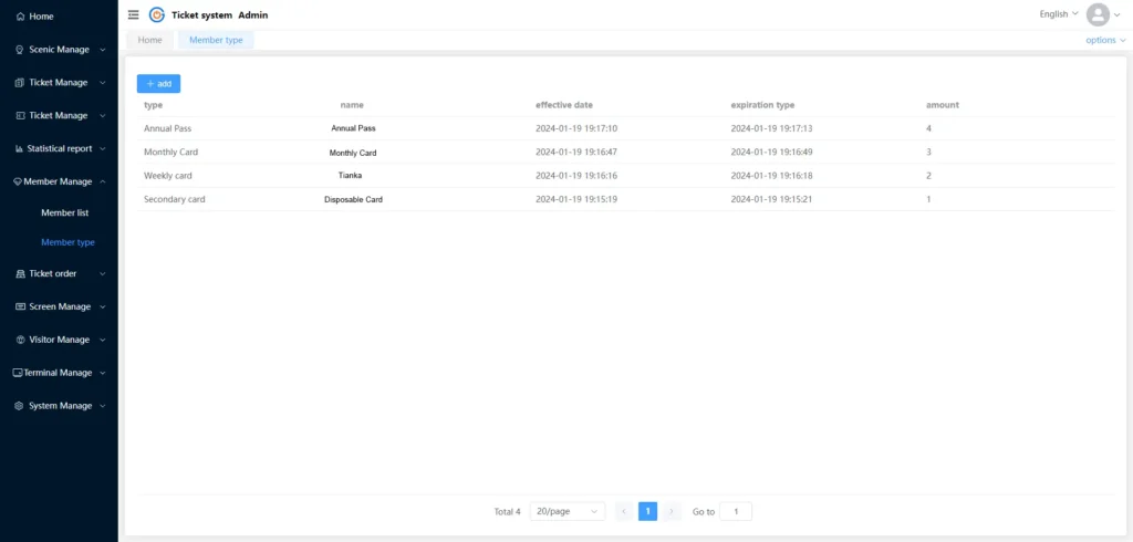 Scenic spot ticketing management system 1.0 supports Chinese and English languages. The system is divided into two roles:super administrator and ticket seller. Super administrators have more advanced permissions to manage scenic area information, ticket information, ticket management, statistical reports, member user management, ticket information screen management, access records, and gate equipment management. The ticket seller has lower level permissions and can perform ticket sales operations, view statistical reports, manage ticket orders, member users, and access records. The ticket seller only has service functions such as ticket sales, ticket data reports, and member entry. The main function of the system is window ticket sales, with two ends for system management.